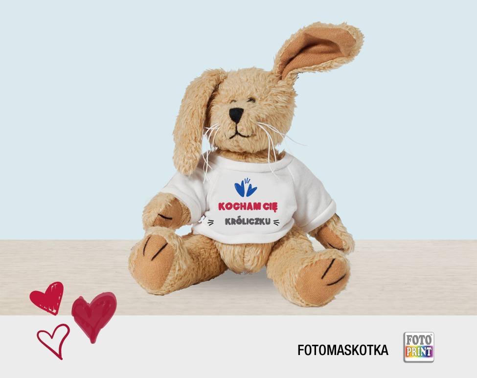W jaki sposób zwracasz się do swojej Walentynki? Używasz określeń: Misiu, Tygrysku, a może Króliczku? Maskotka ze zdjęciem wzbogacona o miłosną deklarację wyrazi więcej, niż mógłbyś powiedzieć. Sympatyczny pluszak będzie doskonałym prezentem dla dziewczyny. Z pewnością przypadnie do gustu twojej Walentynce. Oprócz prezentowanego króliczka możesz również zamówić nadruk na koszulkach innych maskotek, takich jak: miś, tygrysek, krecik czy owieczka.